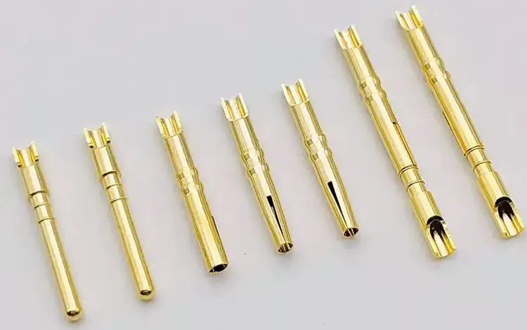 Os pinos do conector são pinos individuais usinados usados para vários aplicativos de plug-in e são funcionalmente os blocos de construção dinâmicos em um sistema de interconexão. Os pinos dos conectores são comumente presos a placas de circuito impressas ou outras caixas, sendo a prensa, arrasada (rebitada), crimpada ou soldada. Os pinos do terminal da PCB servem não apenas como um caminho condutor para um circuito elétrico, mas fornecem força a um módulo de montagem como uma interface mecânica.