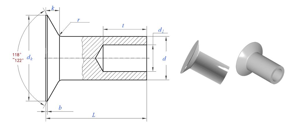 A rebite semi-tubulares de cabeça plana é um tipo de rebite com um orifício parcial no final da haste e uma cabeça plana larga.