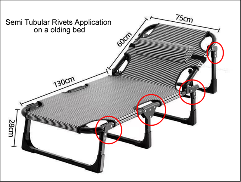 Semi-tubular rivets typically have a solid cylindrical or round head and a hollow tubular tail. During installation, pressure is applied to the tail using a riveting tool, causing it to curl outward and form a secure locking structure. This process requires no pre-tapping or welding, making it suitable for quick assembly. In contrast, solid rivets require greater pressure to deform, while fully hollow rivets (such as blind rivets) rely on the mandrel to break to secure, requiring higher material strength.
